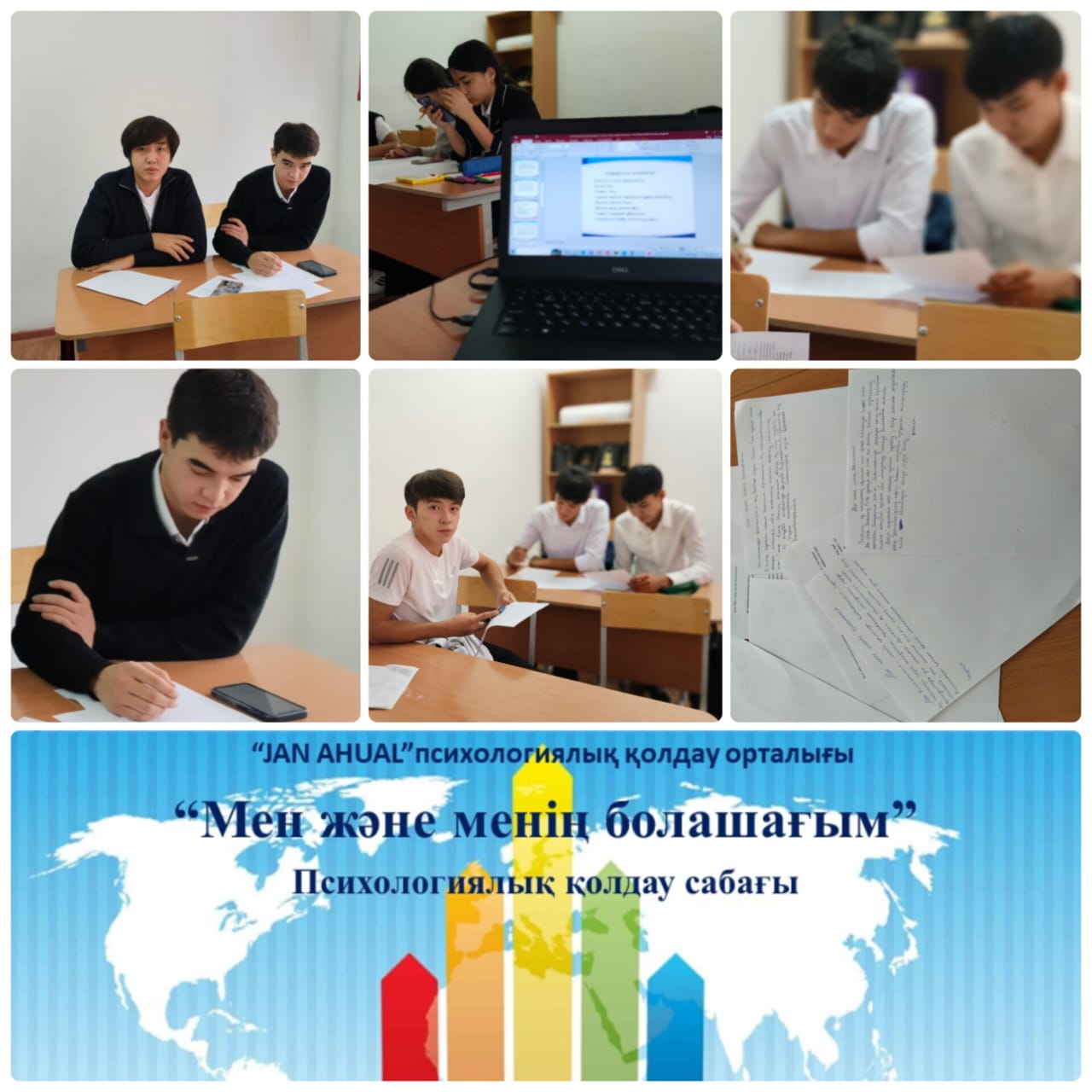 9-11 сынып оқушыларымен «Мен және менің болашағым» тақырыбында психолог сағаты өткізілді. Оқушылар өзін-өзі анықтау және өмірді жоспарлау мәселелерін талқылады. Олар «Жарқын болашақ» тақырыбына плакат жасап, «Мен және менің болашағым» тақырыбында эссе жазды.